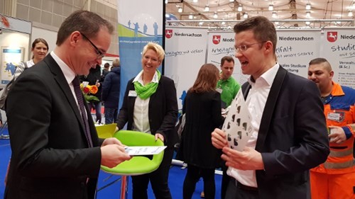 Am 9./10. Februar 2018 fand in der Eilenriedehalle des HCC die 27. „beruf & bildung“ in Hannover statt, für die Ministerpräsident Stephan Weil, Innenminister Boris Pistorius zusammen mit Oberbürgermeister Stefan Schostock die Schirmherrschaft übernommen hatten. Vertreten wurden die Schirmherren des Landes durch unseren Kultusminister Grant Henrik Tonne. Nach der Eröffnung folgte ein Presserundgang zu verschiedenen Ausstellern. Beim Land Niedersachsen – vertreten durch das Ministerium für Inneres und Sport – konnte Herr Minister Tonne das neue Karriereportal selber testen. Durch das neue responsive Webdesign (RWD) ist es für die Zielgruppe überall zu erreichen – sogar auf dem Handy in der Bahn.